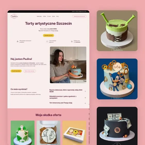 Czytelna prezentacja oferty, galeria realizacji oraz wyraźne wezwania do działania prowadzą użytkowników do kontaktu i zamówienia darmowej wyceny tortu – bez zbędnych rozpraszaczy i skomplikowanej nawigacji.